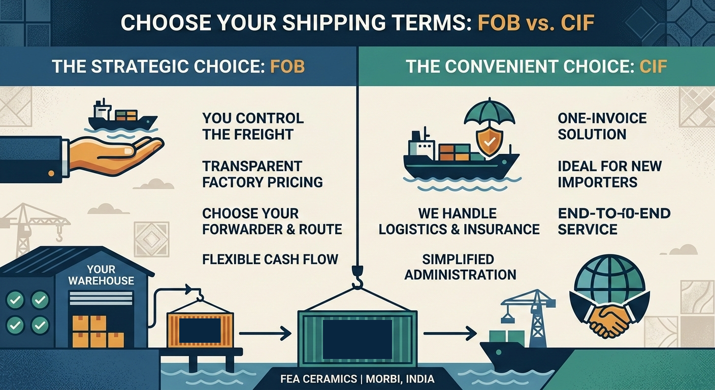 B2B focus,Ceramic Logistics India,Fea Ceramics Export,FOB vs CIF,Freight & Insurance,GVT & PGVT Tiles,International Tile Trade,Logistics & Shipping,Morbi Tile Export,Porcelain Tile Importers,Tile Importing Guide